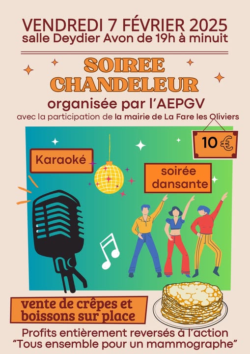 L’AEPGV organise une soirée chandeleur à la salle Deydier Avon, avec au programme : karaoké et soirée dansante.