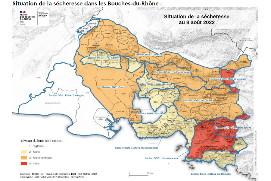 Le 8 août, le Préfet de la région PACA a publié un nouvel arrêté pour instaurer l’état d’alerte renforcée sécheresse sur la Crau. Dans le reste du département des Bouches-du-Rhône, les niveaux d’alerte précédents restent inchangés  :
