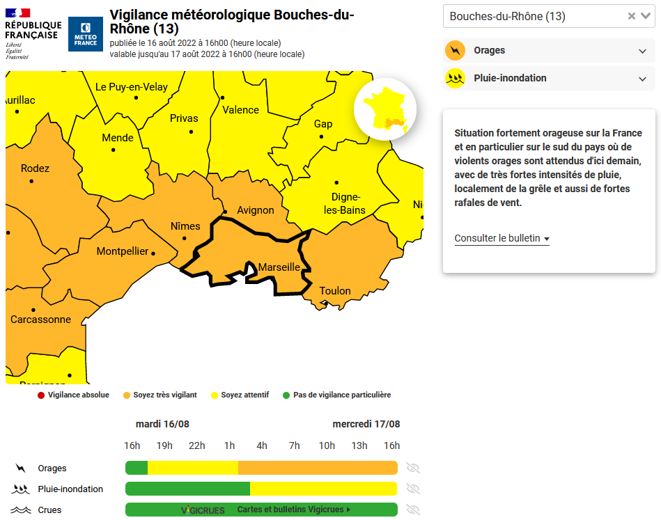 Vous pouvez consulter la carte de vigilance sur le site de Météo France