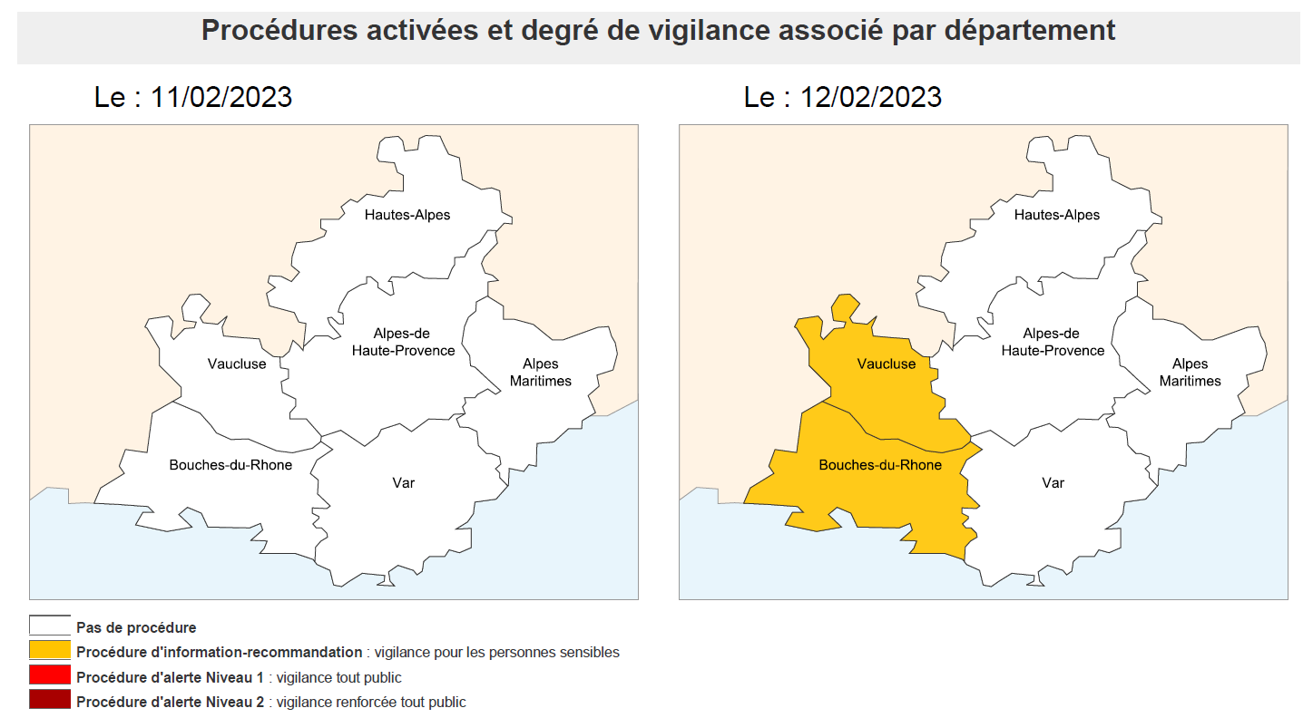 Dimanche 12 février, les conditions peu dispersives et l’accumulation des particules fines sur l’ouest de la région entraîneront une mauvaise qualité de l’air. Les départements du 13 et du 84 ont été placés en vigilance information et recommandation.