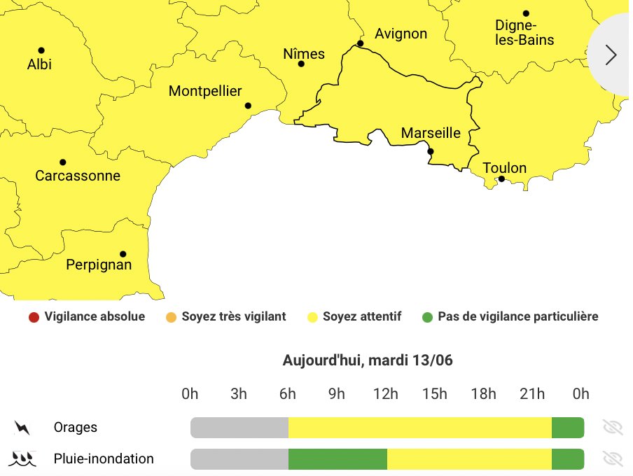 La vigilance jaune orages et pluie / inondation se poursuit ce mardi 13 juin dans les Bouches-du-Rhône jusqu’en soirée.