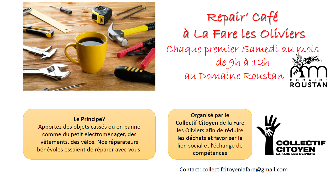 N’hésitez pas à passer la grille du Domaine Roustan le premier samedi du mois, de 9h à 12h pour apporter vos objets cassés, ou rejoindre l’équipe des réparateurs bénévoles.