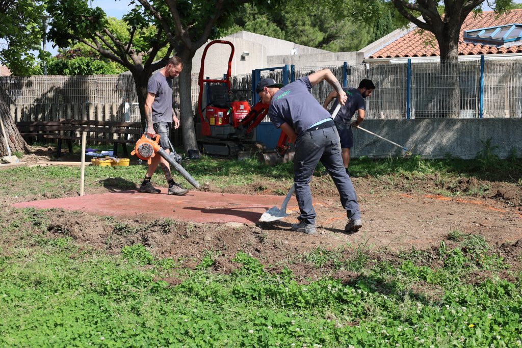 L’entreprise effectue des travaux de préparation avant l’installation d’un sol souple et d’un nouveau jeu pour enfants.