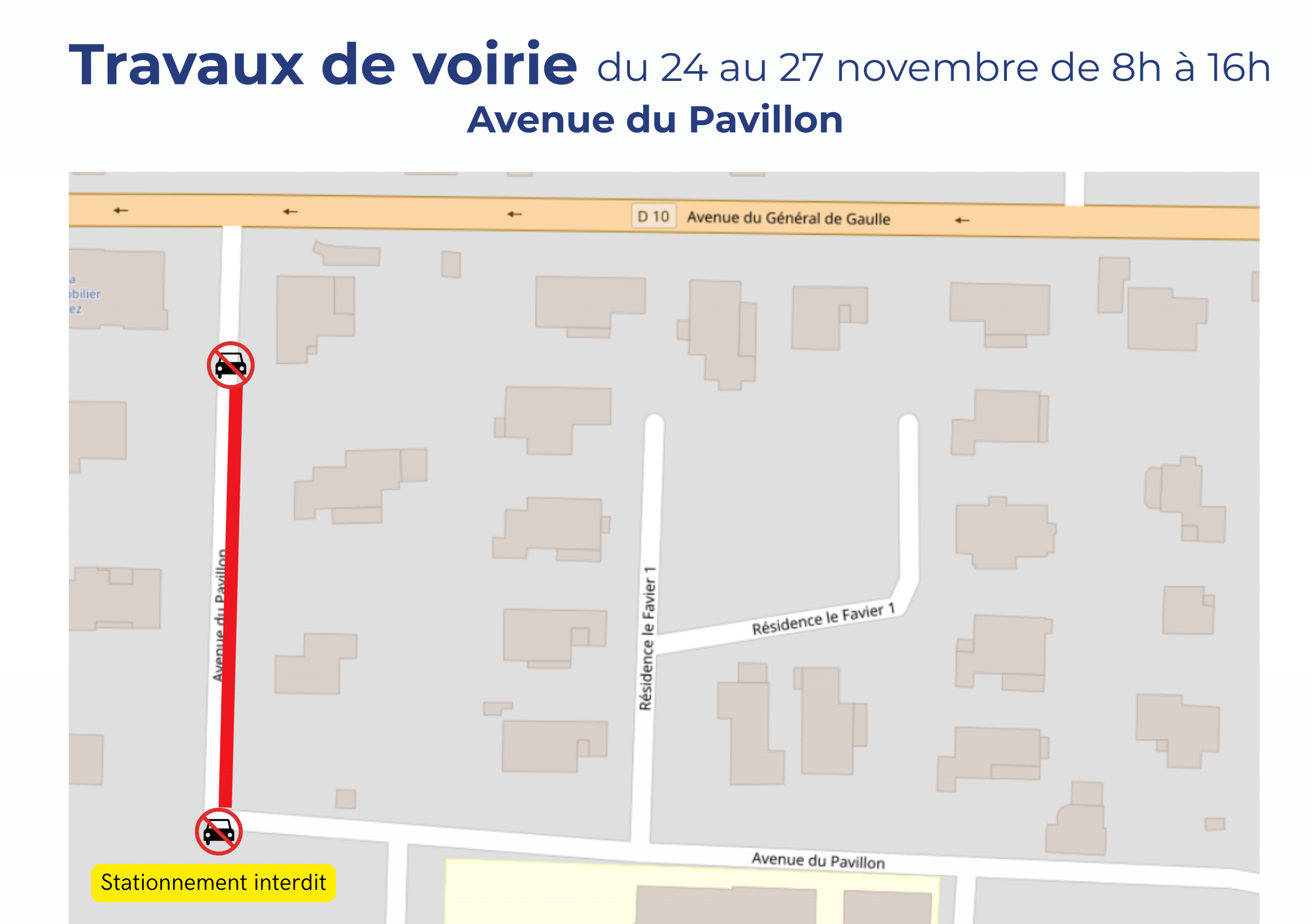 Pendant les horaires de chantier, le stationnement y sera interdit.