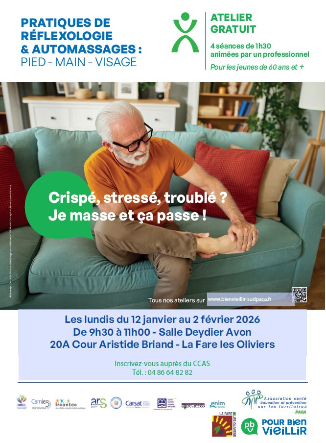 Il reste encore quelques places pour l’atelier « pratiques de réflexologie & automassages : pied, main, visage » qui débutera le 12 janvier prochain.