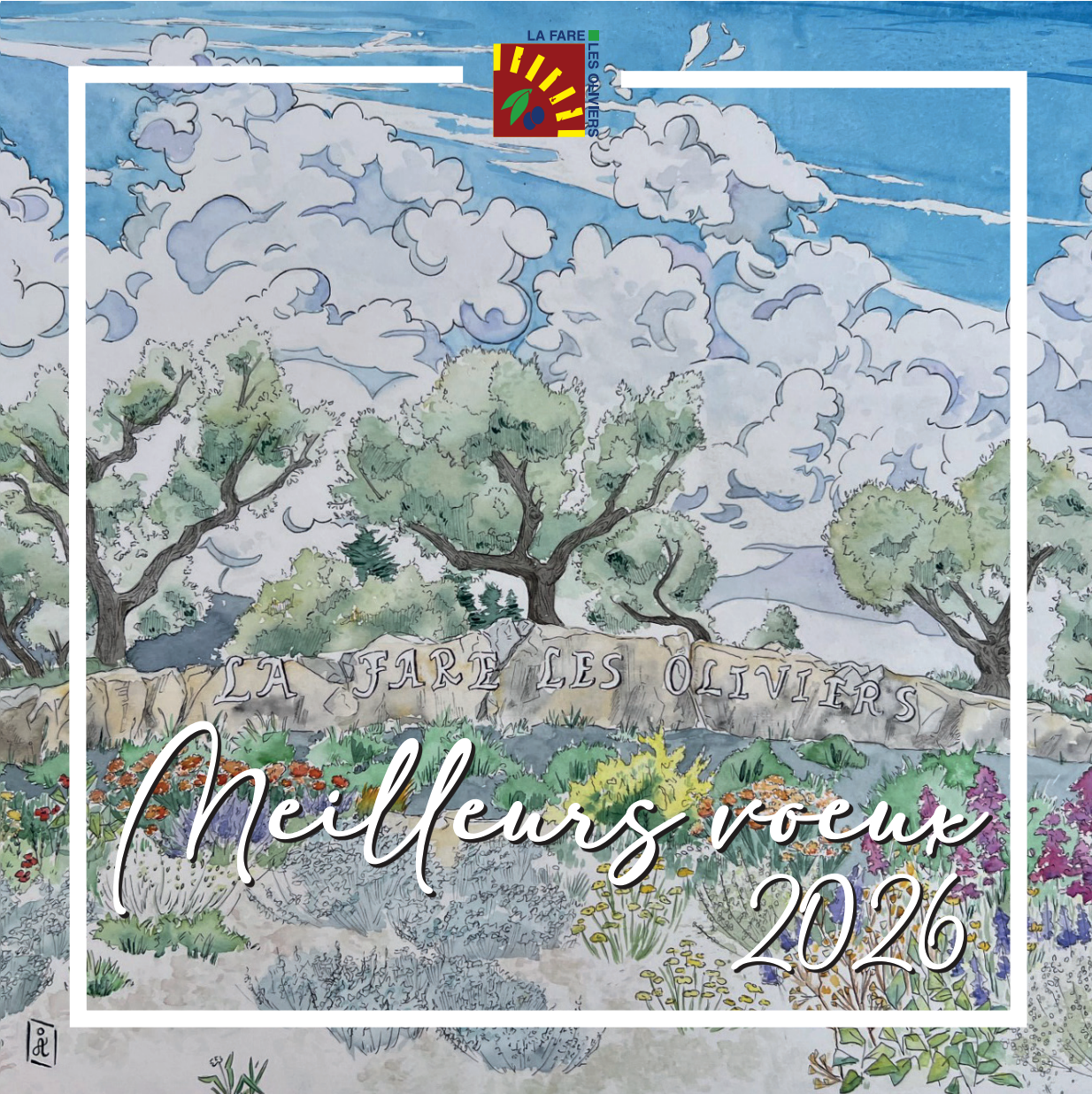 Cette année, la carte de vœux met à l’honneur le travail d’Isaline Agustin, une jeune artiste farenque pleine de talent. Nous la remercions pour cette création originale qui met en lumière l’un des aménagements emblématiques de la commune.