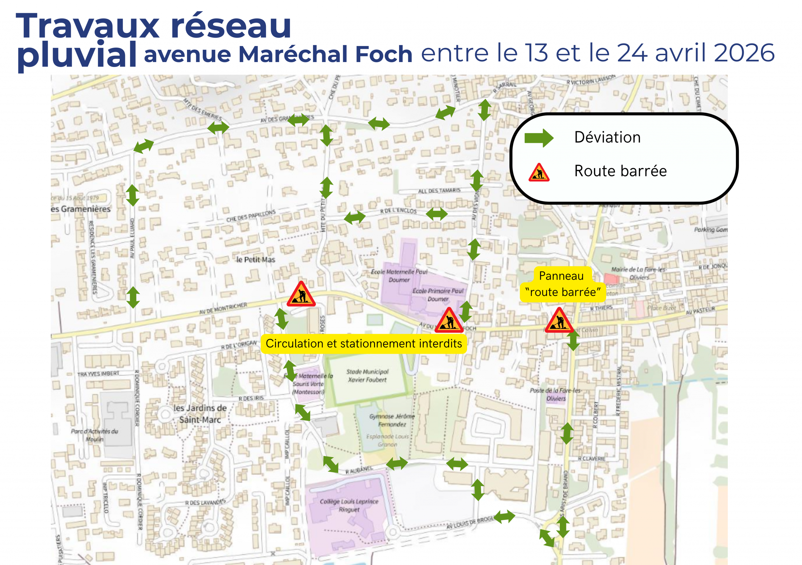 Pendant les 3 jours de travaux effectifs (réalisés en fonction des conditions météorologiques), la circulation et le stationnement seront interdits et une déviation mise en place.