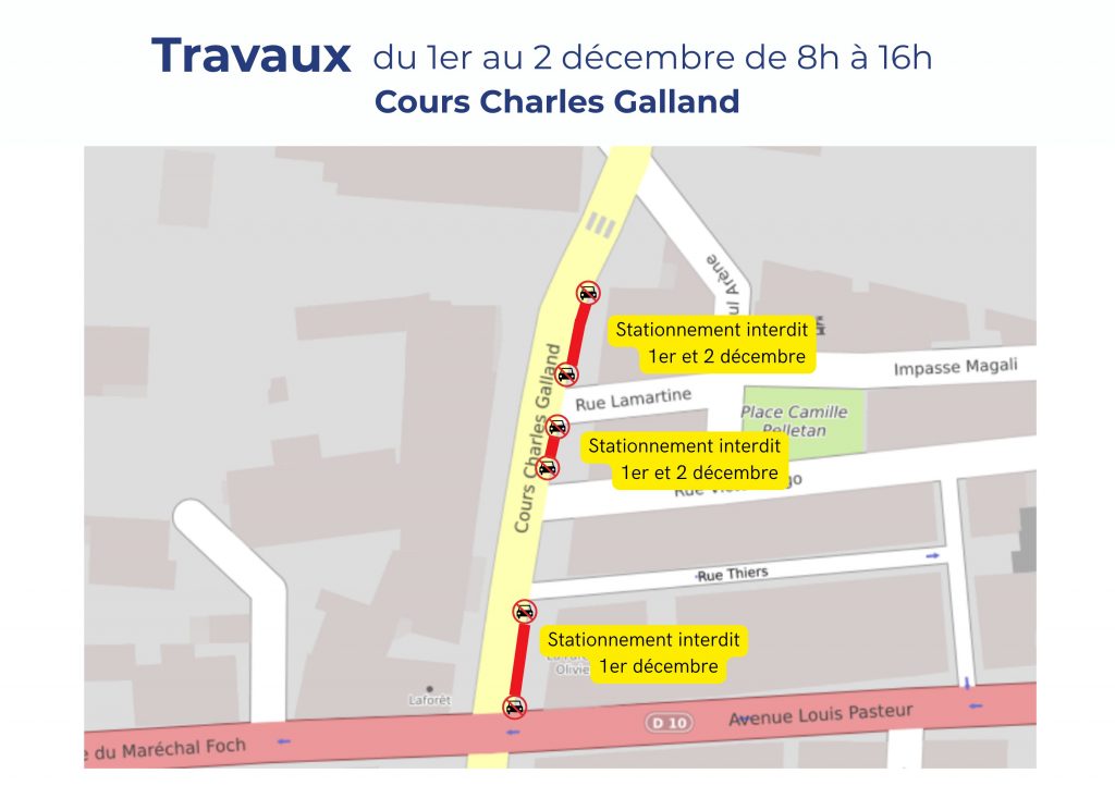 Lundi 1er décembre : stationnement interdit de 8h à 16h sur les places situées entre le n°9 et le n°15 ainsi que les deux places situées devant le magasin Vival.